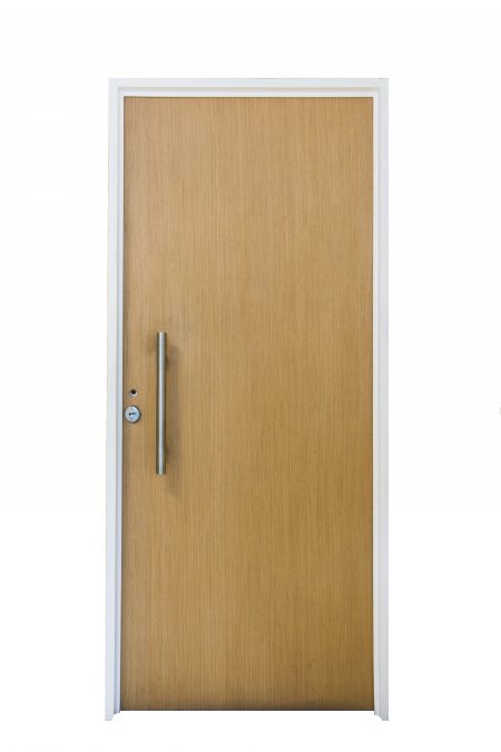 Marco de chapa y hoja de madera: marco N 18 con pomelas de acero inoxidable, burletes intumescentes. Hoja simple contacto en MDF, enchapadas en madera de cedro, wengue o roble eslavonia. Cerradura de seguridad con cilindro Europerfil.