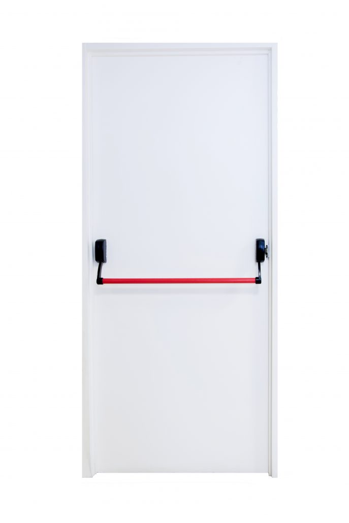 Marco de chapa y hoja de madera: marco Nº18 con bisagras a munición reforzadas, burletes intumescentes. Hoja simple contacto en MDF, enchapadas en madera de cedro, wengue o roble eslavonia. Barral antipánico con acceso exterior con o sin llave.